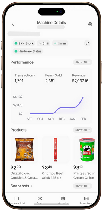 Yes. Everything is available in real-time on your phone- sales, inventory, and performance across all machines.
